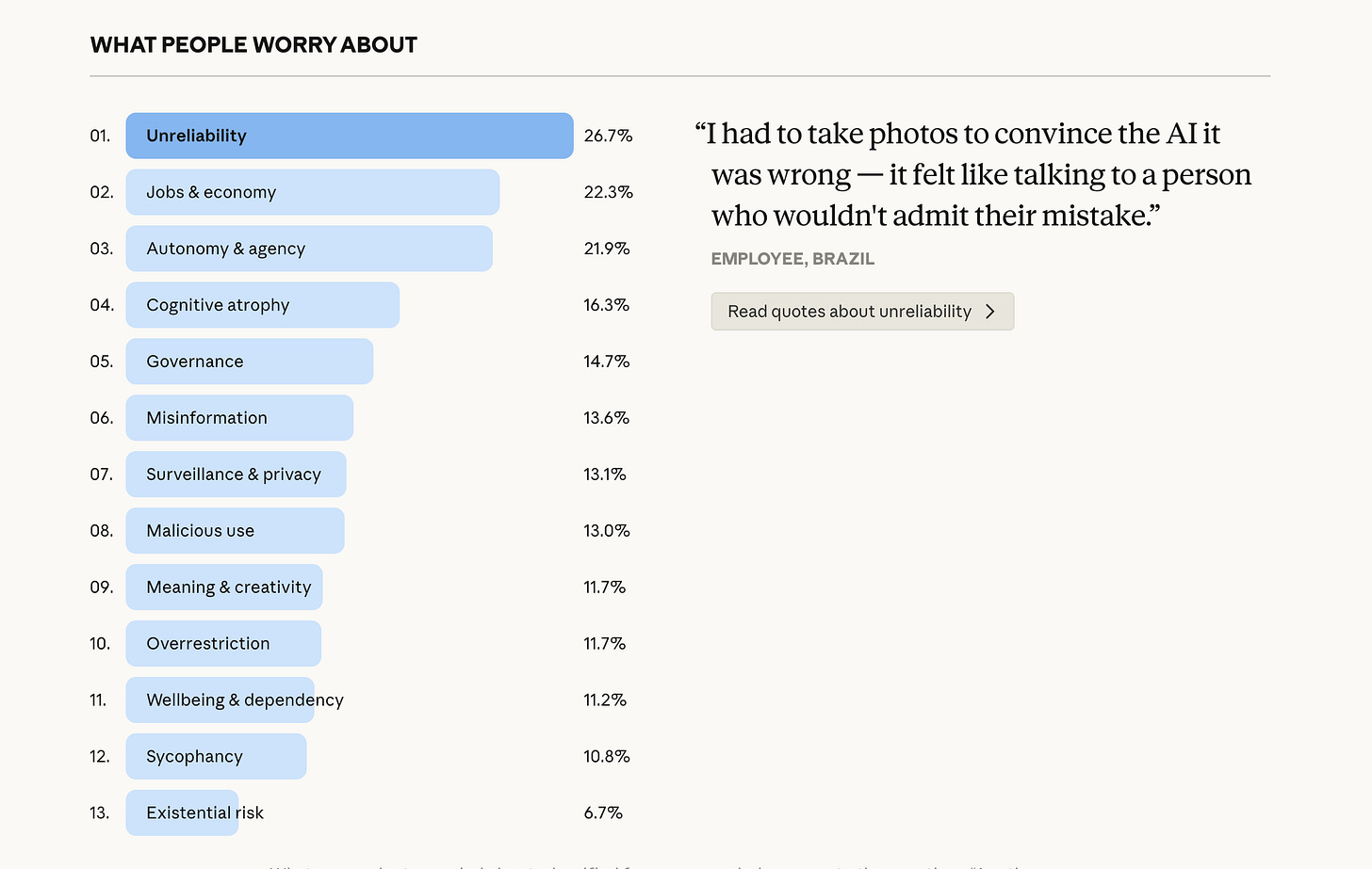 Anthropic recently ran one of the most interesting studies I’ve seen on this. It invited Claude users to describe how they use AI today, what they hope it could unlock in their lives, and what worries them most. More than 80,000 people across 159 countries and 70 languages participated, which makes this less like a normal product survey and more like a global snapshot of how people are beginning to fit AI into everyday life.