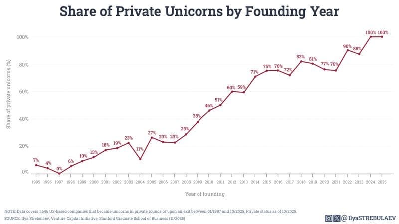 A recent analysis by Stanford GSB’s Ilya Strebulaev shows a clear shift in how long unicorns remain private. The takeaway is simple but important: private capital has reduced the urgency to exit, and public markets are no longer the default endgame.