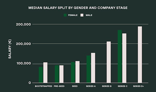 At Series C, female founders even slightly out-earned their male peers in median compensation.
