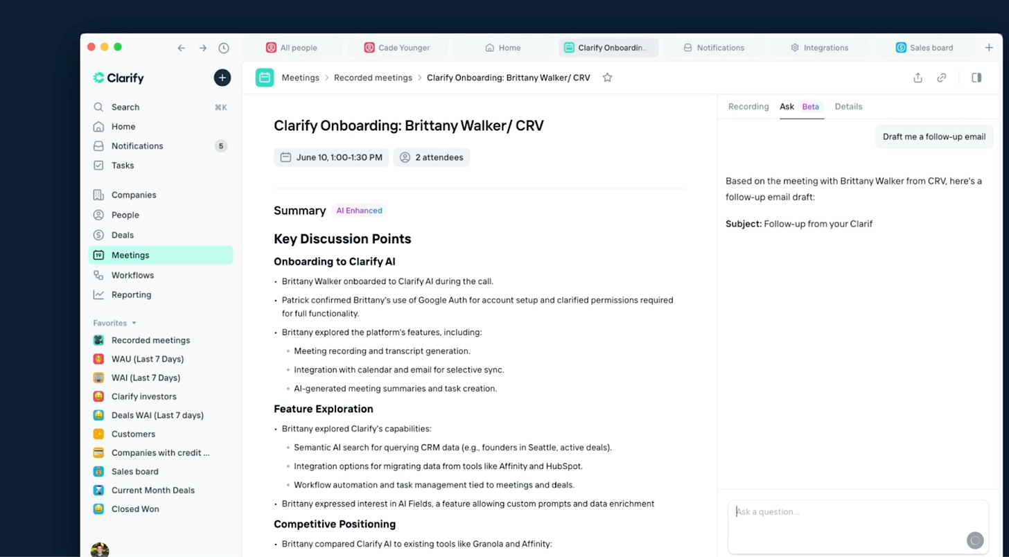 Clarify generates a tailored summary, logs structured call notes into your CRM, updates your pipeline in real-time, and even drafts a ready-to-send follow-up email.