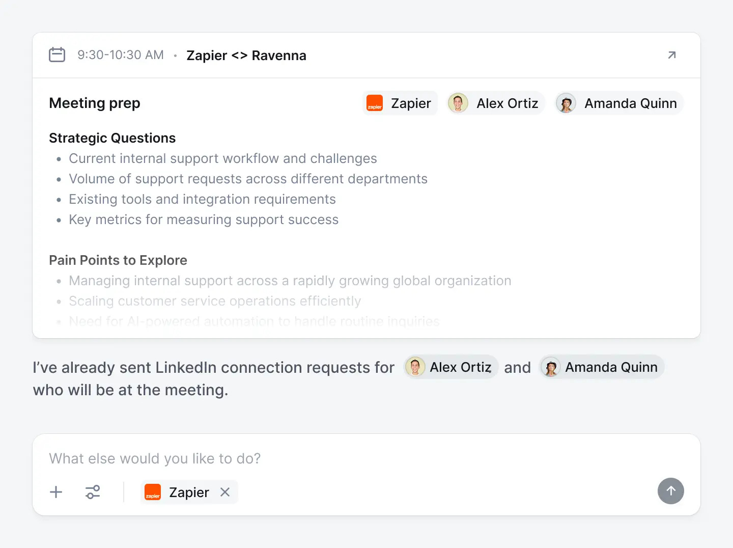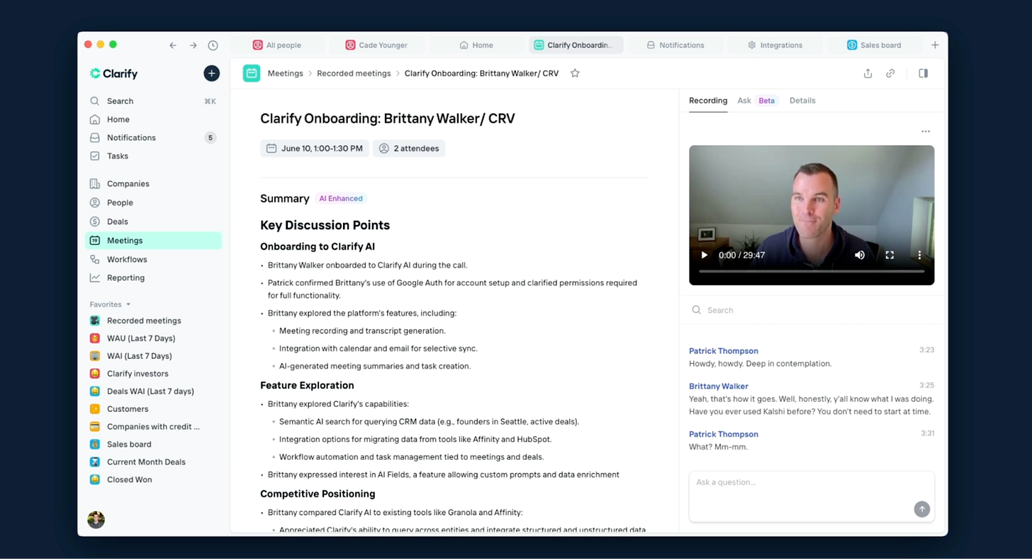 Clarify enriches contact profiles with job titles, LinkedIn, company info, and context from previous conversations, so youâre never scrambling through tabs before a meeting.
