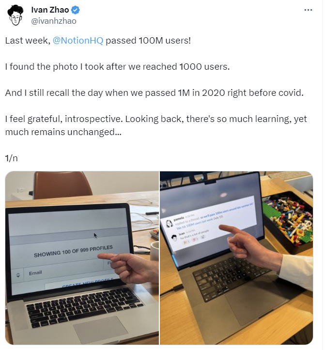 Notion passed 100 million users. The Notion co-founder shared a tweet about building Notion.