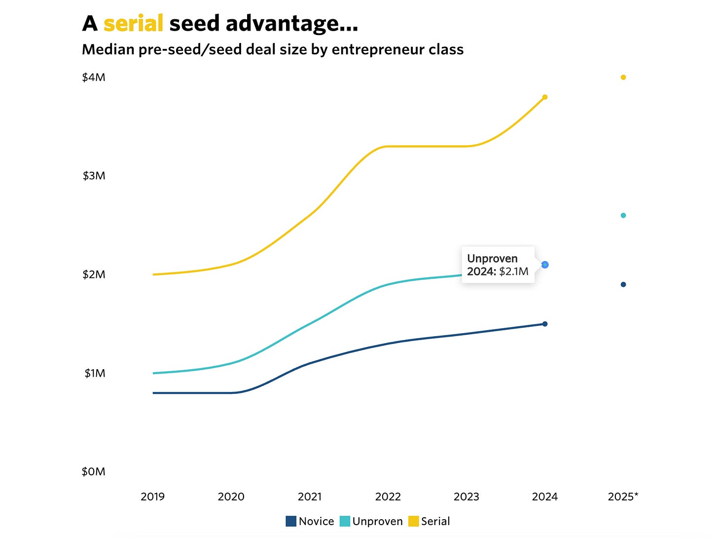 Valuation premium: Startups led by serial entrepreneurs are valued 2–3x higher than those led by first-timers, across every stage. The gap starts early and compounds as companies scale.