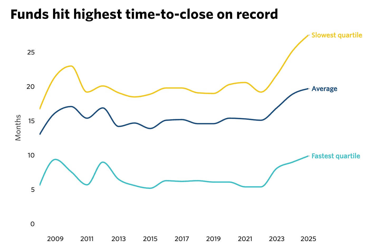 Time-to-close keeps climbing: PitchBook’s Q2 2025 report shows the average private capital fund now takes 19.7 months to close, up from 18.9 months in 2024 and 14.6 months in 2019. Managers are being told to expect to still be in the market a year after first close.