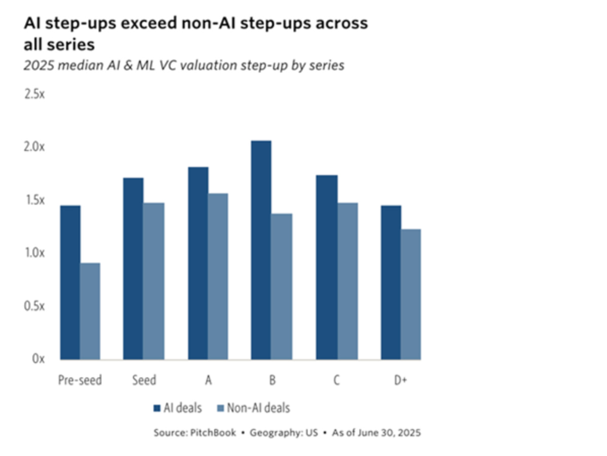 AI is the outlier. Median Series B step-up for AI startups is 2.1x, versus 1.4x for non-AI. Faster cycles, bigger checks, and resilient multiples define the sector.