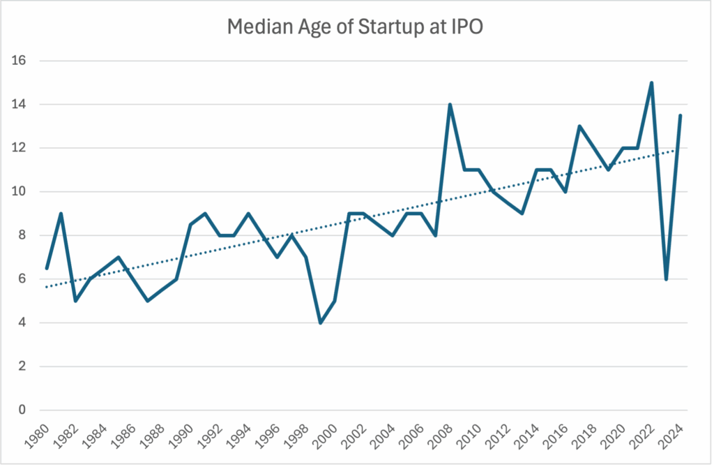 The “young and fast IPO” startup story is fading. According to University of Florida data, the median age of a company at IPO was 13.5 years in 2024, far older than the 5–9 year median from the 1980s–2000s.