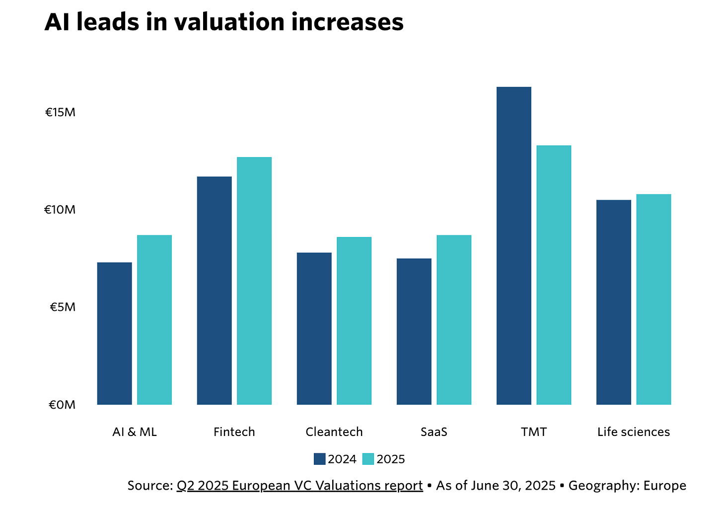AI is driving the bump: Early-stage AI startups are seeing the biggest jumps. Median valuations in AI rose ~19% to €8.7M, signalling investor appetite for “AI-native” companies rather than incumbents bolting on AI features.
