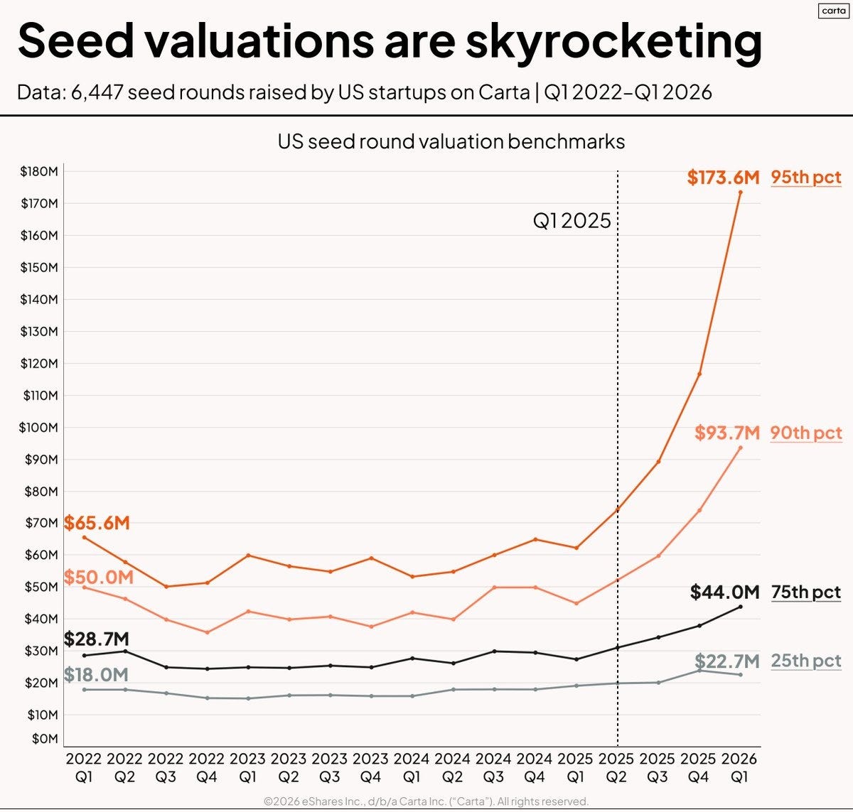Lucas Vaz recently laid this out using fresh data, and the shift is hard to ignore. Seed valuations have exploded. The top 5% of seed rounds are now regularly happening at $150M–$175M+ valuations, up nearly 3x in a short period. Even median-ish rounds have moved up meaningfully.