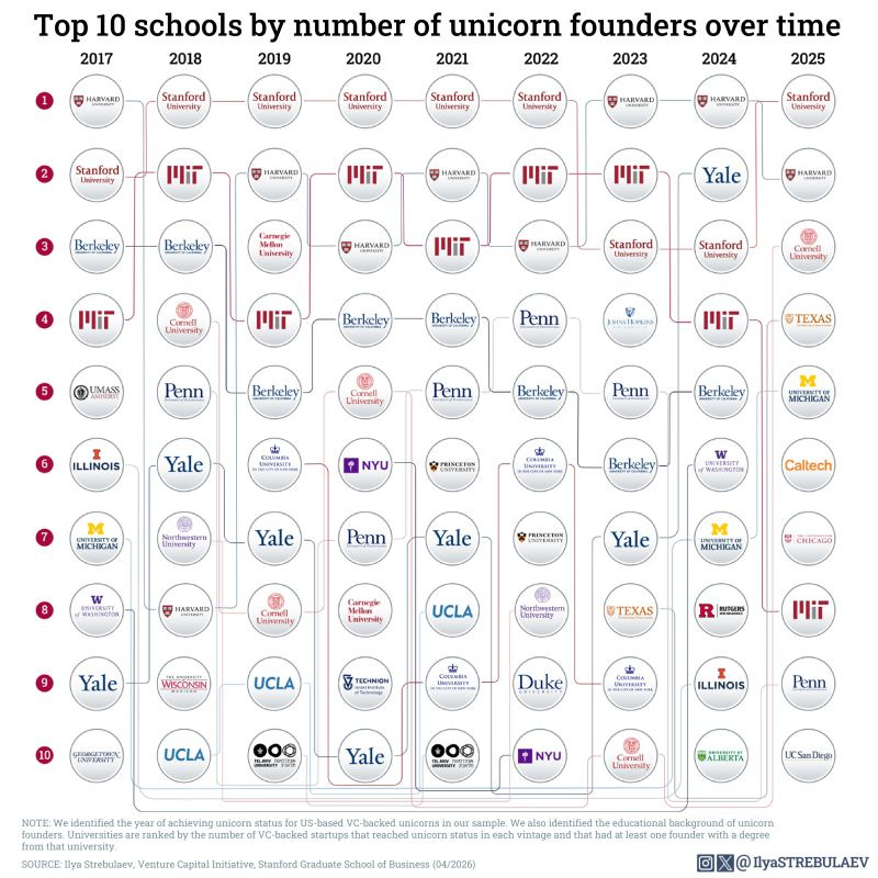 In an expanded analysis covering unicorn founders from 2017 to 2025, Stanford’s Ilya Strebulaev tracked which universities consistently produce founders of billion-dollar companies.