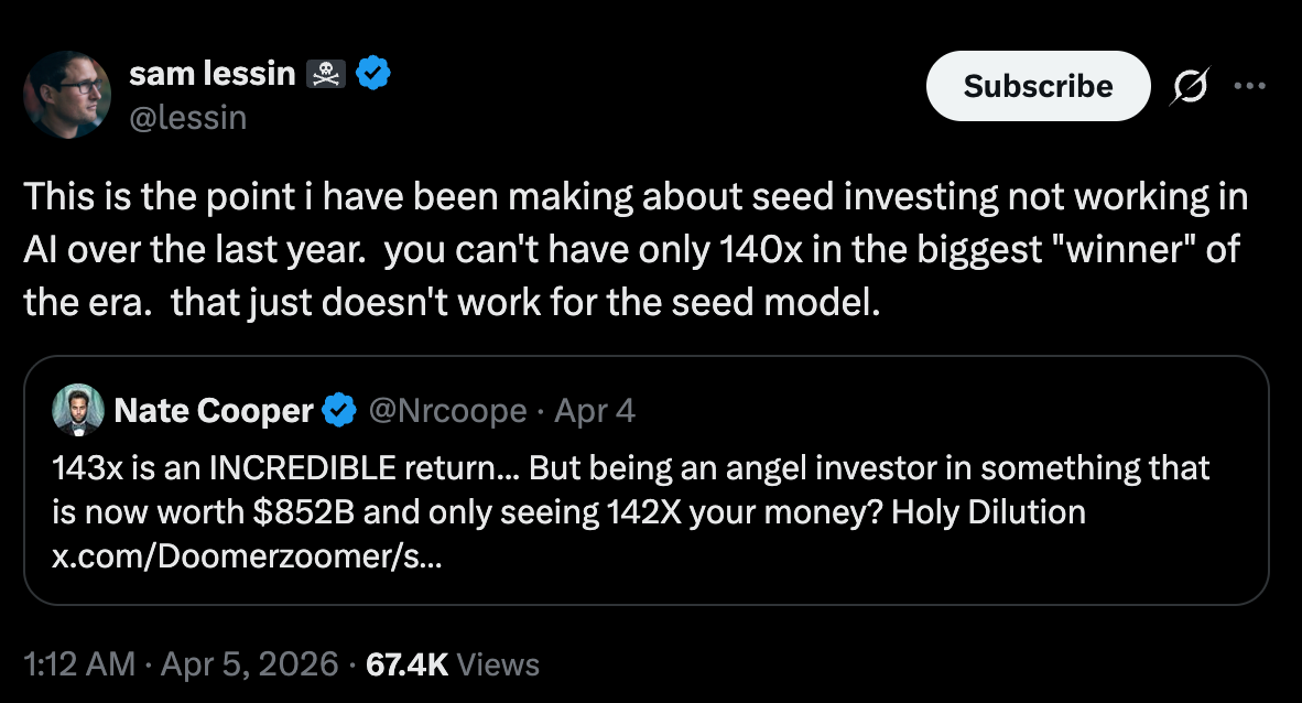 If your fund had only a small position in the biggest company of the decade, even a 140x outcome may not return your fund meaningfully. The combination of high entry prices, heavy dilution, and massive capital flowing into winners is compressing returns at the very top.