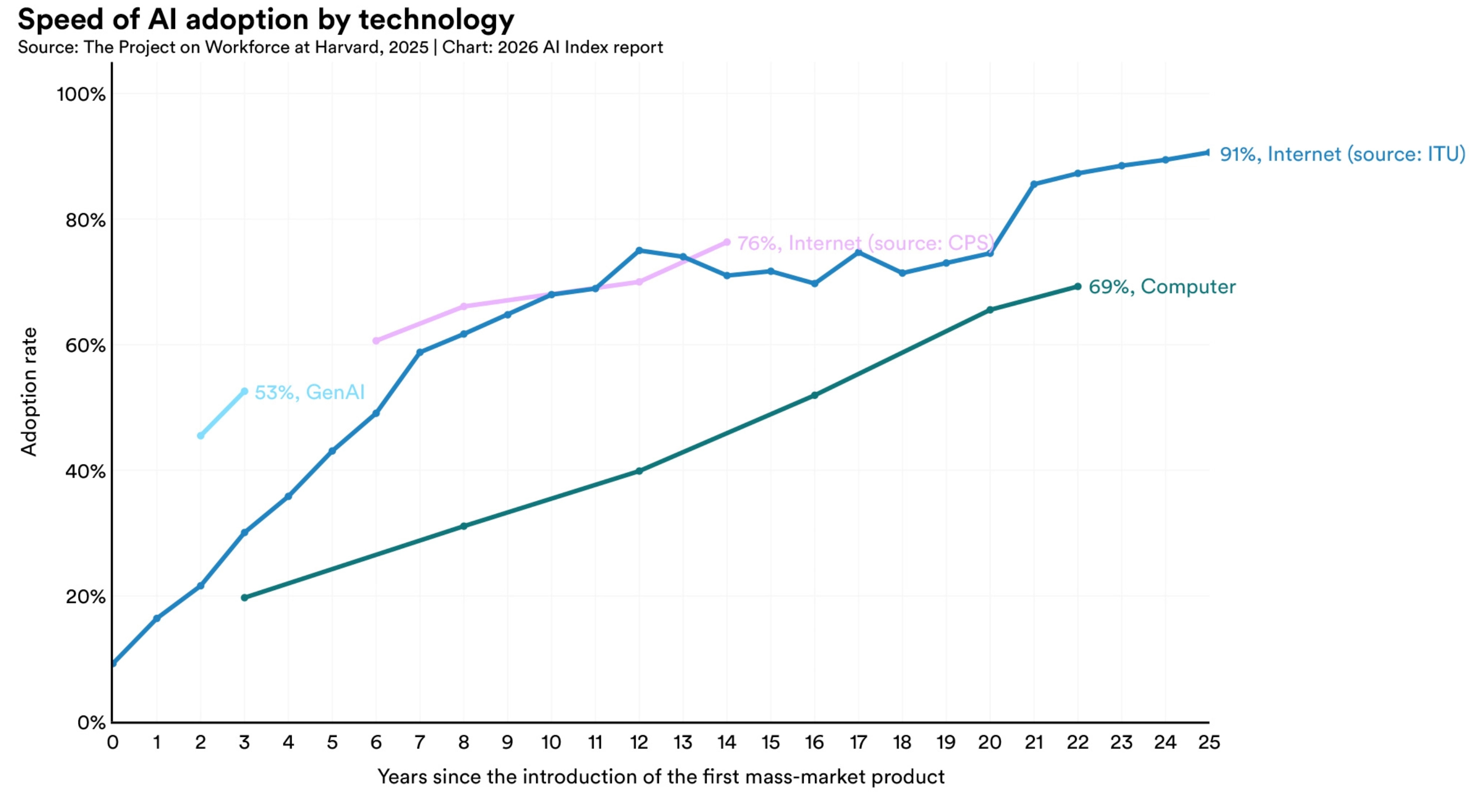 AI has reached 53% population adoption in just 3 years, faster than both the internet and the PC.