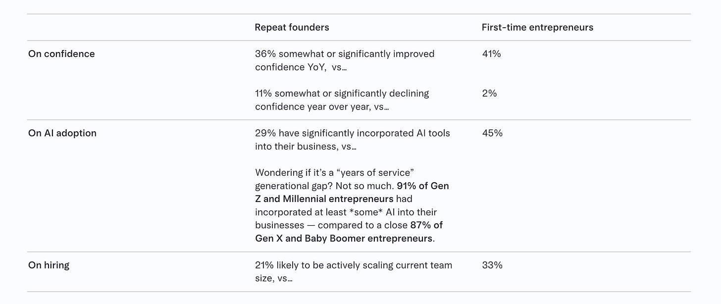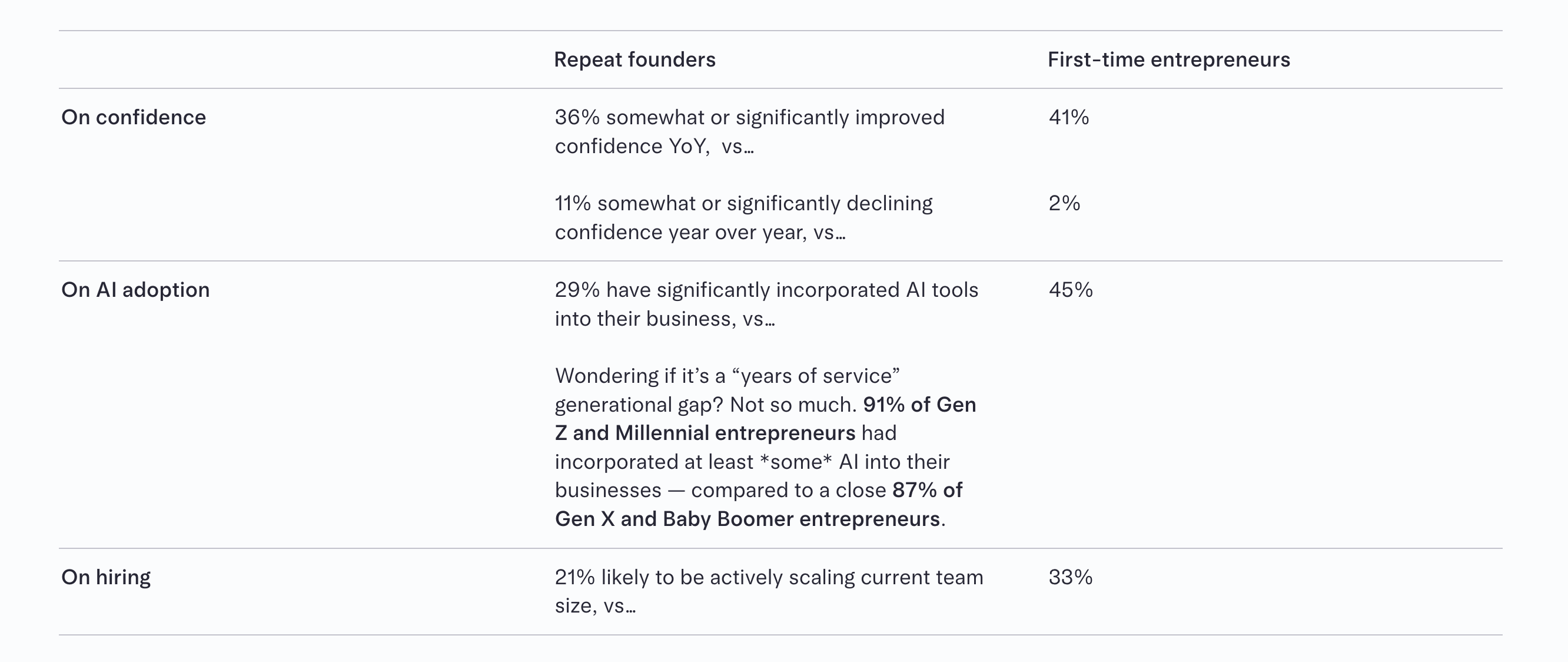 87% of founders say their confidence in their business’s financial prospects has improved since 2024. That number jumps to 93% among companies that have significantly adopted AI. First-time founders are also more optimistic (88%) than repeat founders (76%).