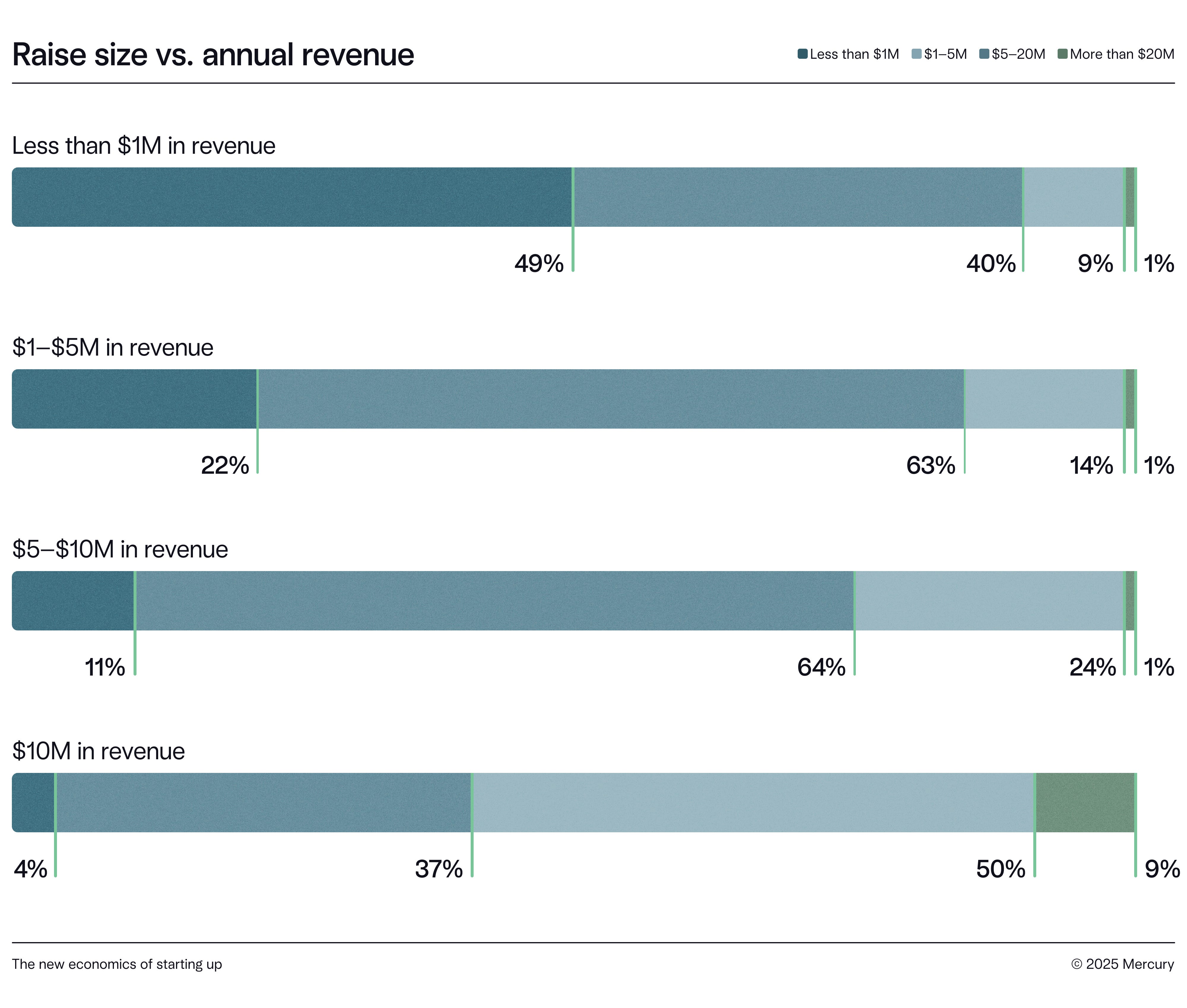 Big fundraising doesn’t always equal high revenue. Many lean companies are finding alternative paths to profitability, with a sweet spot at $5–10M revenue, where most raise $1–5M. Half of $10M+ revenue companies still operate with fewer than 100 employees.