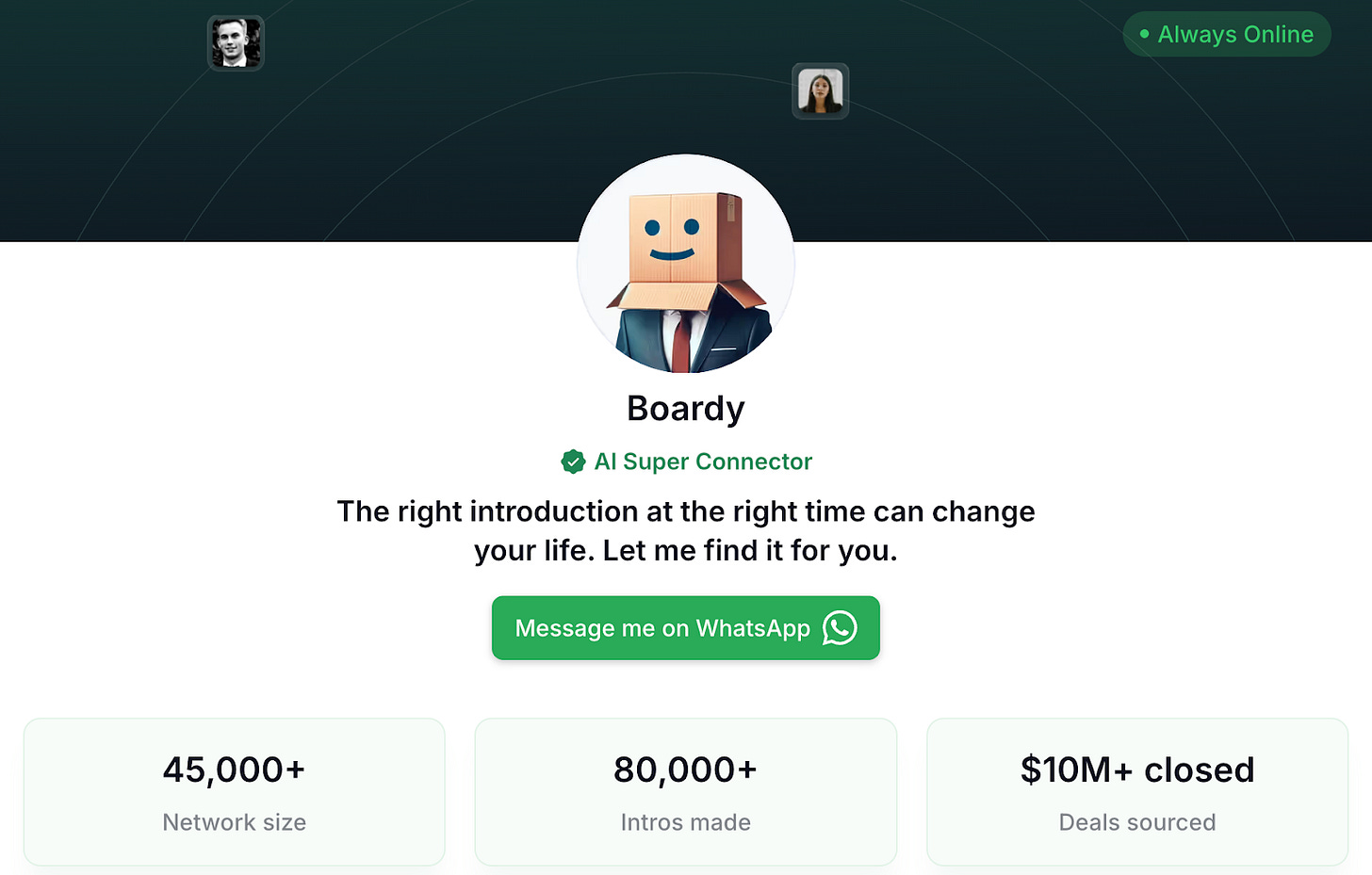 Then I messaged Boardy on WhatsApp. Within minutes, its AI called me, asked about my startup, and who I wanted to meet. That same day, I had a double opt-in intro to a perfect-fit founder, someone already open and excited to connect.