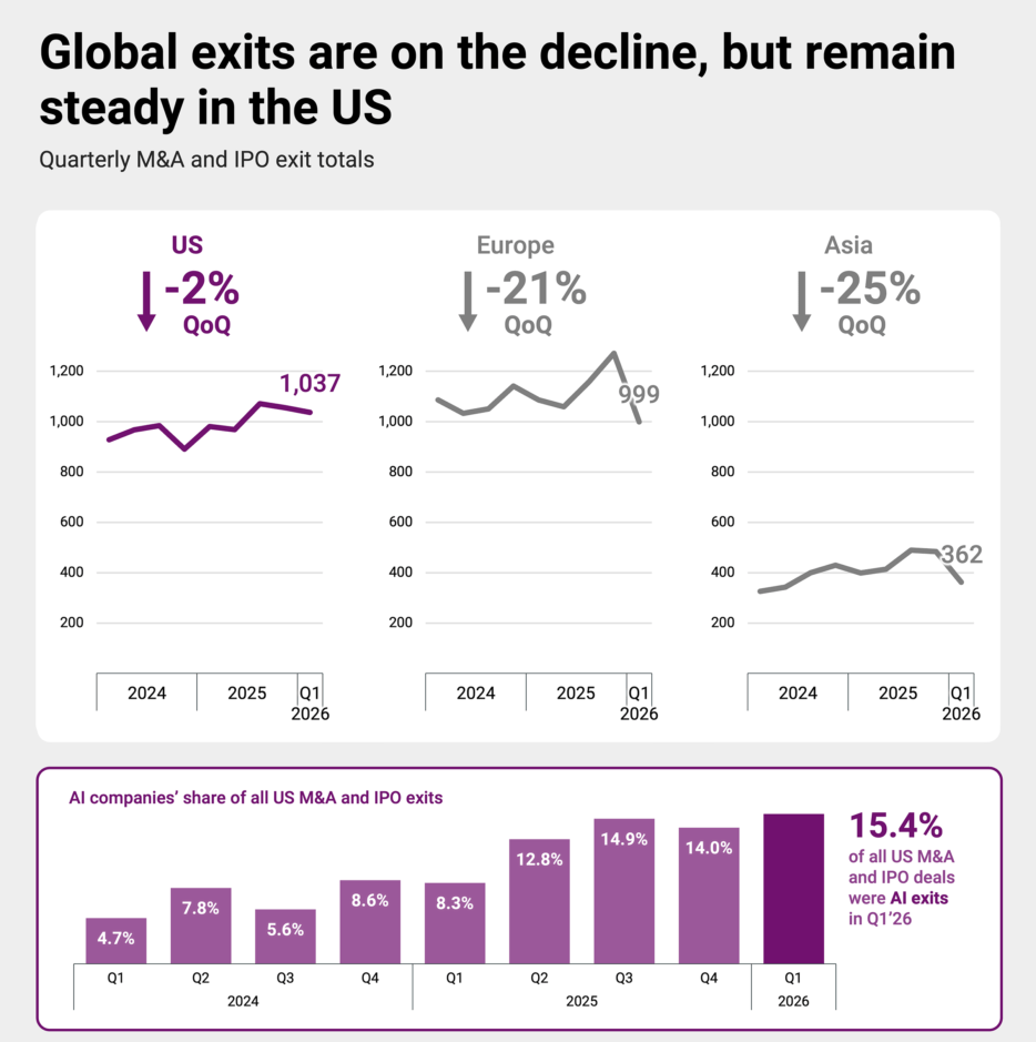 But the latest Q1’26 data from CB Insights tells a more nuanced story. Yes, global exits have slowed. But they haven’t disappeared - they’ve become highly selective, and increasingly concentrated in specific regions and sectors.