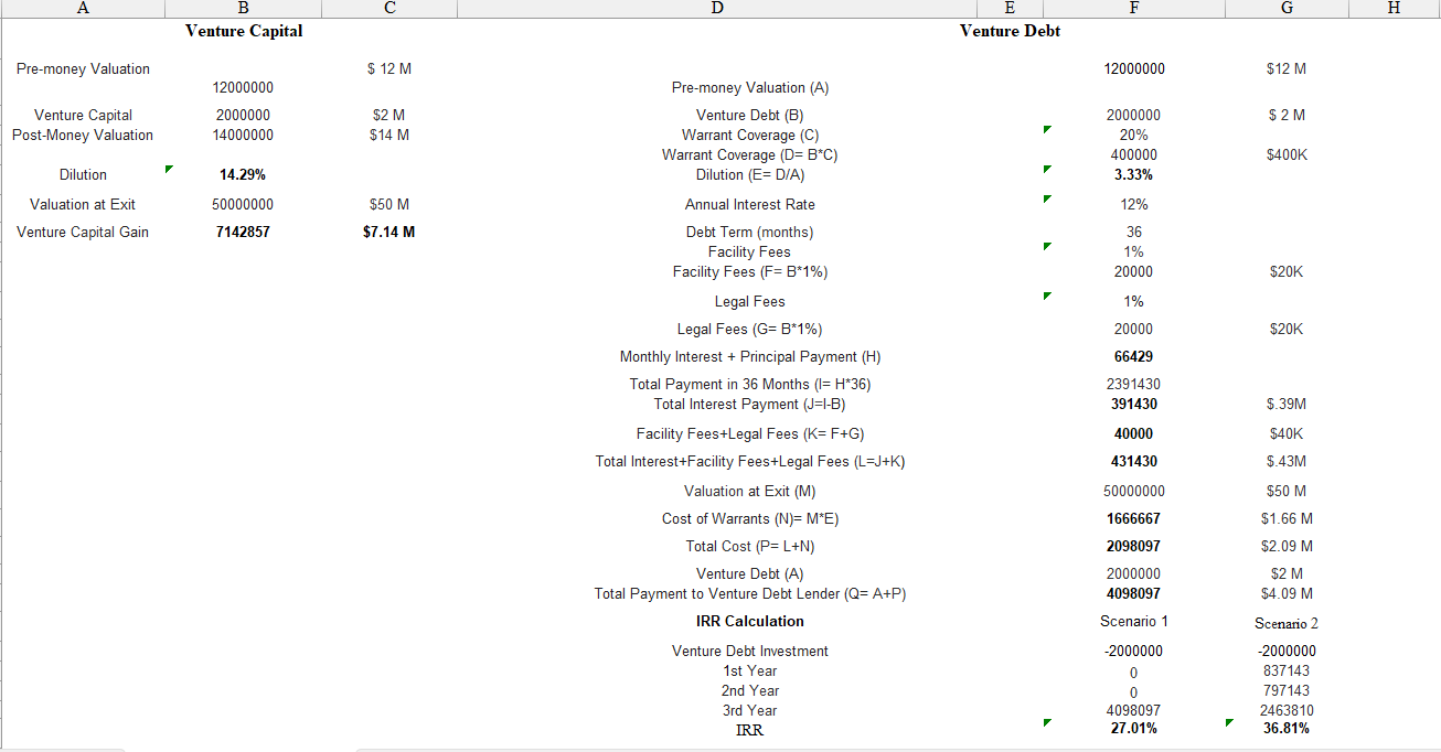 - Venture Debt Annual Interest Rate= 12% (monthly 1%)